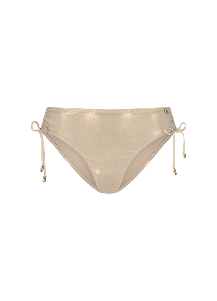 Artikelnummer 370209-174 Brandcode 70 Kleur Goud,Metallic,Taupe Maat 36 (S),38 (M),40 (L),42 (XL),44 (XXL) Materiaal 85% Polyamide, 15% Elastaan Seizoen SS23 Serienaam Gold Champagne Soort Bikinibroekje Normale fit